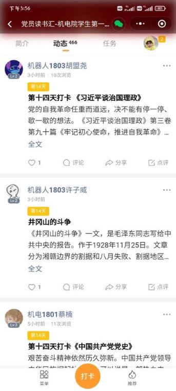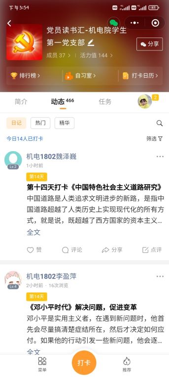 活动中,党员读书交流小组利用微信小程序建立读书圈,全体成员阅读党史类相关书籍,连续打卡14天。学生党员们积极参与,按时按量完成打卡并附上自己的学习心得体会。通过线上打卡与线下交流相结合的方式,党员们在经典书目中汲取了强大精神力量。
